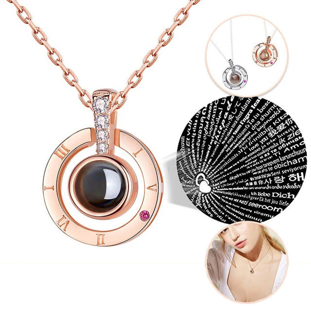 El colgante incorpora un diseño con numerales romanos y un cristal central que proyecta "Te amo" en 100 idiomas, haciendo de este regalo algo mágico e inolvidable.