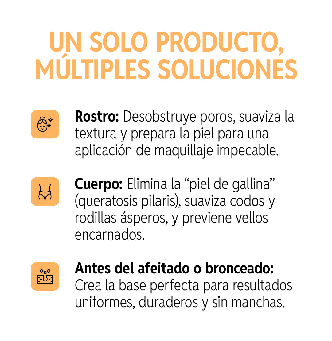 - En el cuerpo: Aplica una cantidad considerable (del tamaño de una moneda) y masajea durante 5 minutos hasta retirar la piel muerta. Enjuaga bien y seca con un trapo limpio.